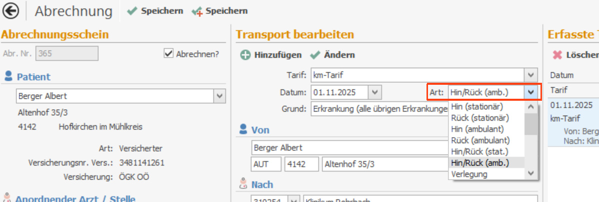 Für die korrekte Verrechnung der Selbstbehalte durch die Kassen an die Patienten ist es notwendig, dass Sie bei der Verrechnung die Transportgründe richtig einstellen.
